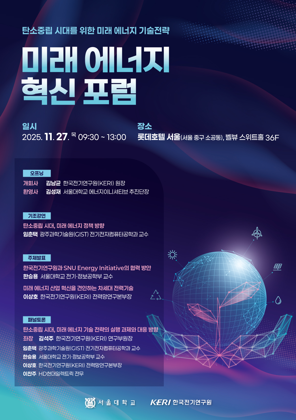 [한국전기연구원] 미래 에너지 혁신 포럼 개최 안내(2025.11.27.목 09:30~13:00) 작성자 관리자 2025-11-20 (등록 링크)_미래 에너지 혁신 포럼 : https://forms.gle/twdeqvhFwiqxDYoJ6 첨부파일 첨부파일이 존재하지 않습니다. 이전글 제 2회 스마트그리드 아이디어 공모전 개최(접수마감 : ~'25.12.26.) 다음글 [서울특별시] 전기안전관리법 시행에 따른 전기차 충전시설 신고제 시행 안내 목록 미리보기 미리보기 파일을 불러오는 중입니다. 로딩이 오래걸리면 미리보기를 다시 눌러주세요.