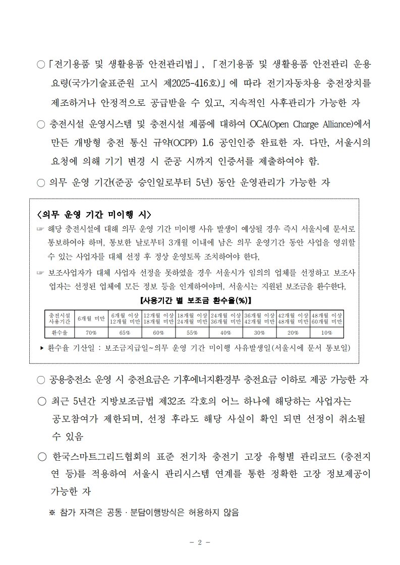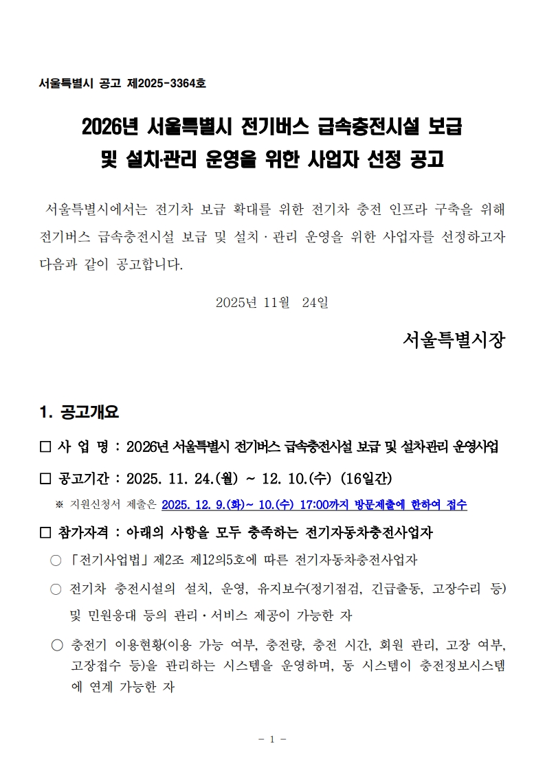 [서울특별시] 2026년 서울특별시 전기버스 급속충전시설 보급 및 설치관리 운영을 위한 사업자 선정 공고 작성자 관리자 2025-11-25 첨부파일 2026년 전기버스 급속충전시설 공모 서류.zip (1.8M) 이전글 [서울특별시] 전기차 급속충전시설 보급 및 설치관리 운영을 위한 사업자 선정 공고 다음글 제32차 한국스마트그리드협회 표준 제정 결과 5종 안내 목록 미리보기 미리보기 파일을 불러오는 중입니다. 로딩이 오래걸리면 미리보기를 다시 눌러주세요.