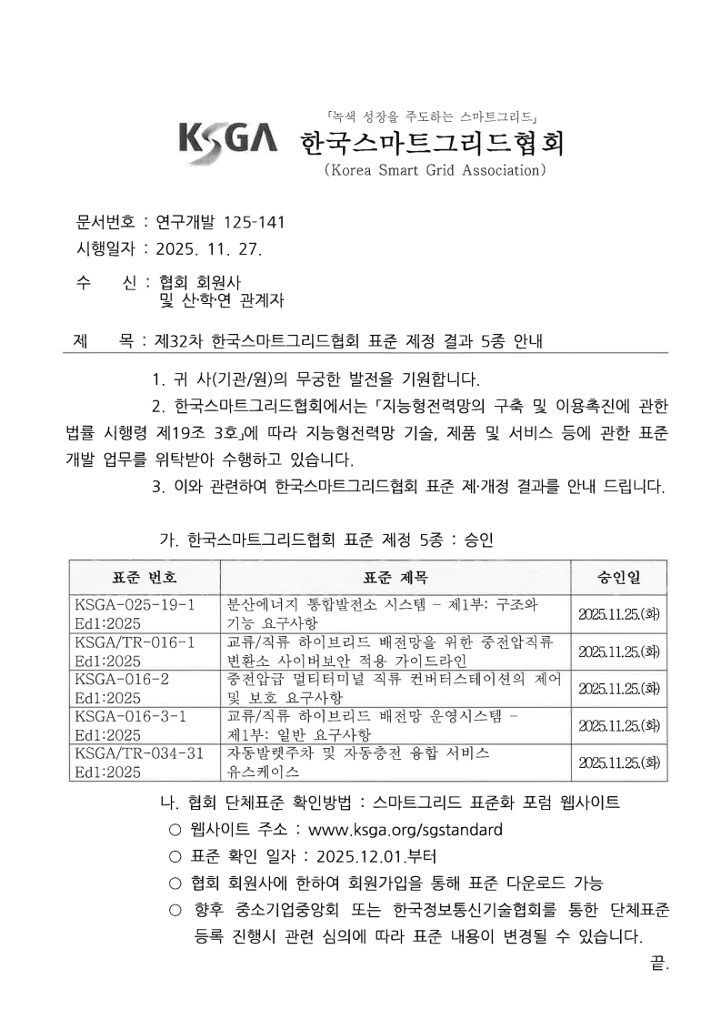 제32차 한국스마트그리드협회 표준 제정 결과 5종 안내 작성자 관리자 2025-12-03 첨부파일 첨부파일이 존재하지 않습니다. 이전글 [서울특별시] 2026년 서울특별시 전기버스 급속충전시설 보급 및 설치관리 운영을 위한 사업자 선정 공고 다음글 [고용노동부] 2026 임금체계 개편 컨설팅 수요조사(전기/전자 제조업 분야) 목록 미리보기 미리보기 파일을 불러오는 중입니다. 로딩이 오래걸리면 미리보기를 다시 눌러주세요.
