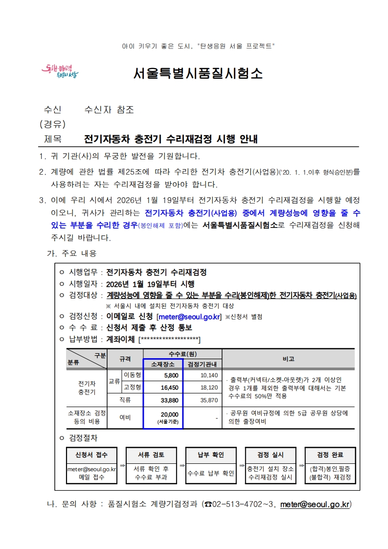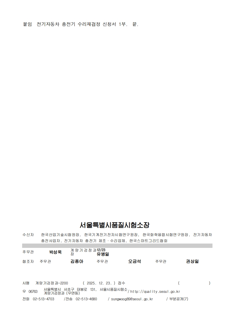 [서울특별시] 전기자동차 충전기 수리재검정 시행 안내 작성자 관리자 2025-12-24 첨부파일 (붙임) 전기자동차 충전기 수리재검정 신청서 서식.hwp (52.5K) 이전글 [고용노동부] 2026 임금체계 개편 컨설팅 수요조사(전기/전자 제조업 분야) 목록 미리보기 미리보기 파일을 불러오는 중입니다. 로딩이 오래걸리면 미리보기를 다시 눌러주세요.