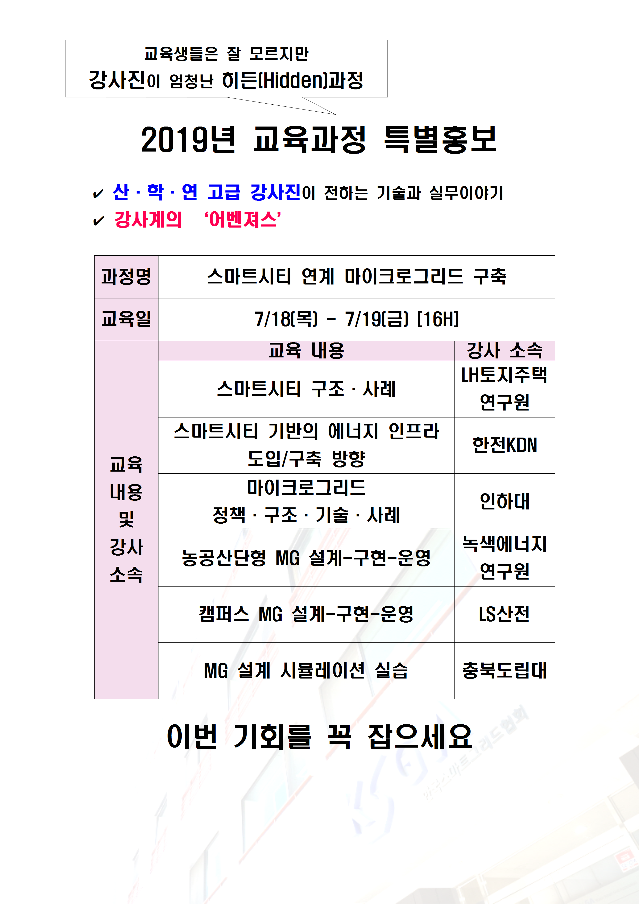 (특별교육홍보) 스마트시티 기반 MG 구축과정 홍보 (7.18-7.19) 작성자 관리자 2019-07-08 이전글스마트그리드 데이터 센터 뉴스레터 제 11호 다음글스마트그리드 데이터 센터 뉴스레터 제 12호 목록 미리보기 미리보기 파일을 불러오는 중입니다. 로딩이 오래걸리면 미리보기를 다시 눌러주세요.