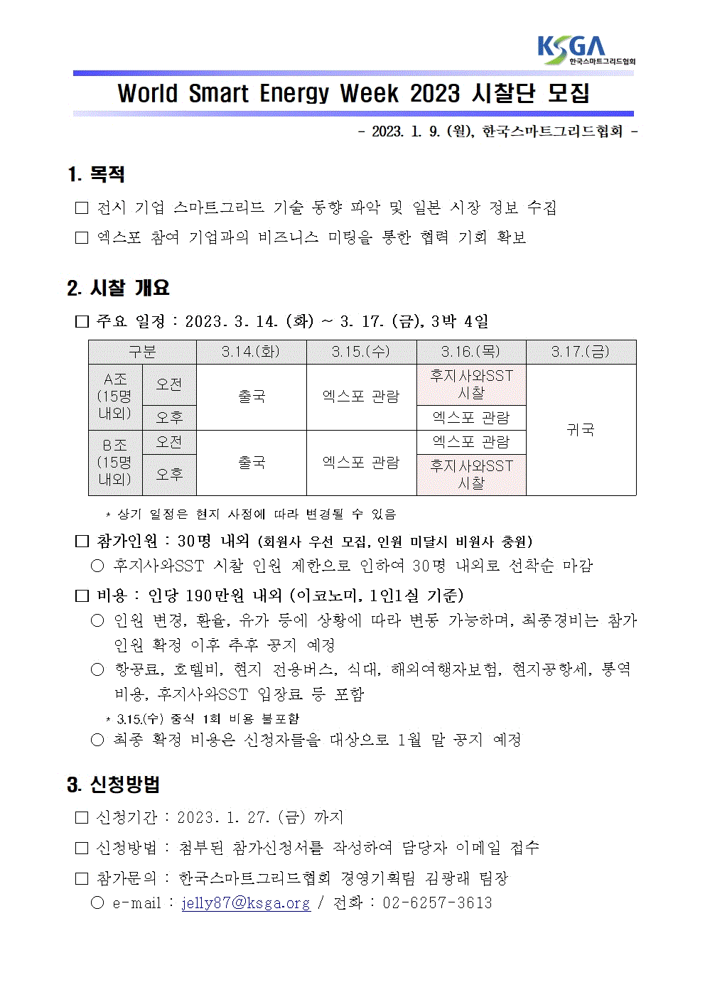 World Smart Energy Week 2023 시찰단 모집 작성자 관리자 2023-01-10 첨부파일 [첨부 4] WSEW 2023 시찰 참가 신청 및 개인정보 수집 이용 동의서.xlsx (16.9K) [첨부 3] 일본경제산업성 2017 스마트커뮤니티 사례집 후지사와SST.pdf (335.9K) [첨부 2] 후지사와SST 브로셔.pdf (6.2M) [첨부 1] World Smart Energy Week 2023 시찰단 모집 (1).pdf (543.1K) 이전글(공지) 2023년도 교육프로그램 브로슈어 다음글2023년도 스마트그리드 캠퍼스 교육비 안내 (대규모기업) 목록 미리보기 미리보기 파일을 불러오는 중입니다. 로딩이 오래걸리면 미리보기를 다시 눌러주세요.